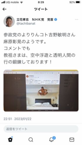 1月23日のスクショ。立花孝志*1も吉野敏明のツィートのスクショを投稿しているので、スクショのスクショということになる。 さて、若い方には、麻原彰晃(或いは滝本太郎)の「空中浮遊」を知らないという人も少なくないのでは? 私は当時(1990年代半ば)…
